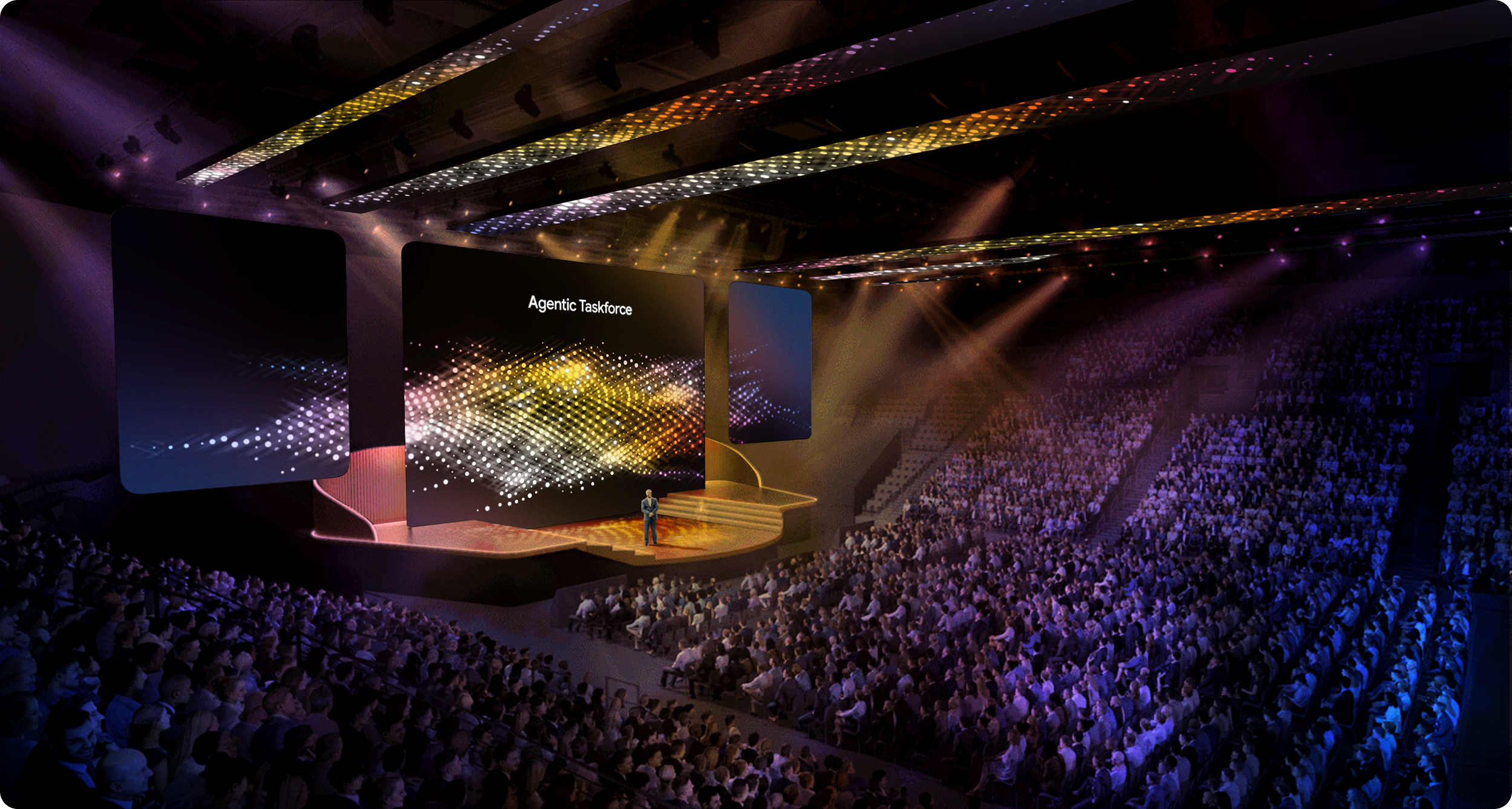 At the pinnacle of the system, everything activates. The structured field breaks into a distributed network of specialized agents, moving in coordinated patterns that suggest both autonomy and alignment. This is where intelligence becomes action - a taskforce of agents operating in parallel, adapting in real time, and working together as a dynamic extension of the enterprise.